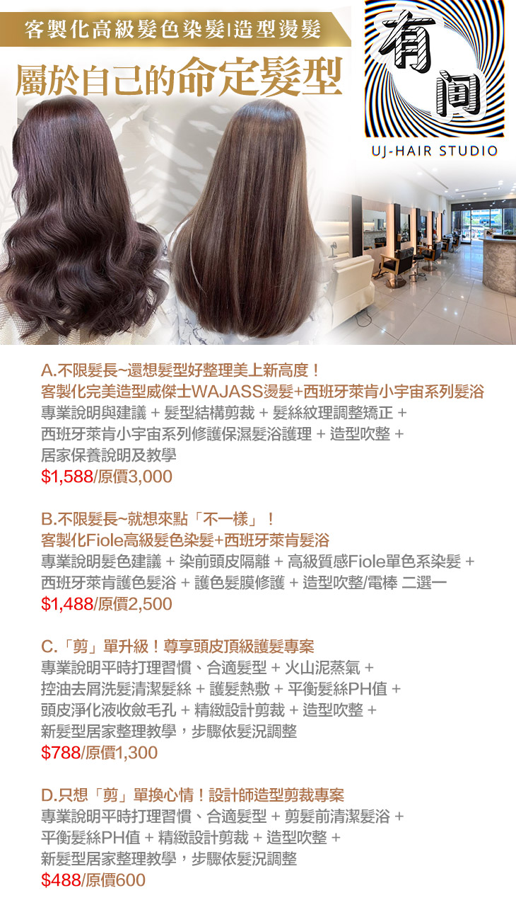 A.不限髮長~還想髮型好整理美上新高度!客製化完美造型威傑士WAJASS燙髮+西班牙萊肯小宇宙系列髮浴 / B.不限髮長~就想來點「不一樣」!客製化Fiole高級髮色染髮+西班牙萊肯髮浴 / C.「剪」單升級!尊享頭皮頂級護髮專案 / D.只想「剪」單換心情!設計師造型剪裁專案