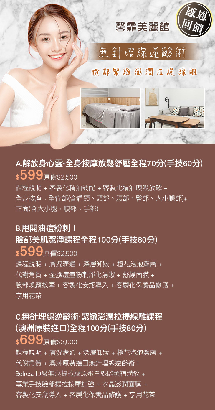 A.解放身心靈~全身按摩放鬆紓壓全程70分(手技60分) / B.甩開油痘粉刺!臉部美肌潔淨課程全程100分(手技80分) / C.無針埋線逆齡術~緊緻澎潤拉提線雕課程(澳洲原裝進口)全程100分(手技80分)