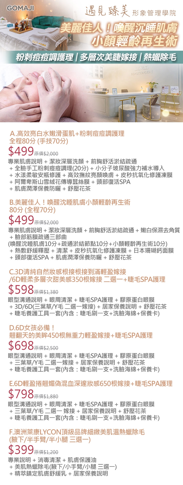 A.高效亮白水嫩滑蛋肌+粉刺痘痘調護理全程80分(手技70分) / B.美麗佳人!喚醒沈睡肌膚小顏輕齡再生術80分(全程70分) / C.3D清純自然妝感根接根接到滿輕盈嫁接/6D輕柔多層次甜美感350根嫁接 二選一+睫毛SPA護理 / D.6D女孩必備!翹翻天的美眸450根無重力輕盈嫁接+睫毛SPA護理 / E.6D輕盈捲翹媚偽混血深邃妝感650根嫁接+睫毛SPA護理 / F.澳洲萊康LYCON頂級品牌細緻美肌溫熱蠟除毛+腋下/半手臂/半小腿 三選一