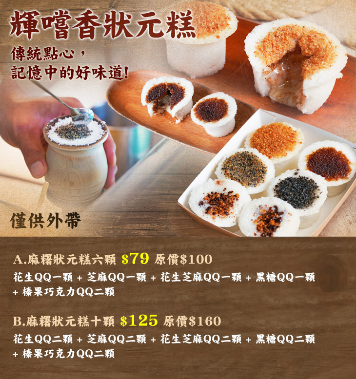 傳統的點心永不過時,為您獻上記憶中的好味道「狀元糕」。其帶有祝福之意,相傳是源自於古代唐朝,主要原料為蓬萊米磨粉以及口味多元的內餡,吃起來類似於麻糬的口感,然而,米的香氣會更加鮮明,咀嚼時也可感受到一股濃濃的懷舊氣息,小小一口就能讓人回味許久,彷彿引領著我們回到過往的年代,享受著簡單美好的純粹時光,不禁沉醉其中、無法自拔,值得您一而再、再而三地細細品嚐。