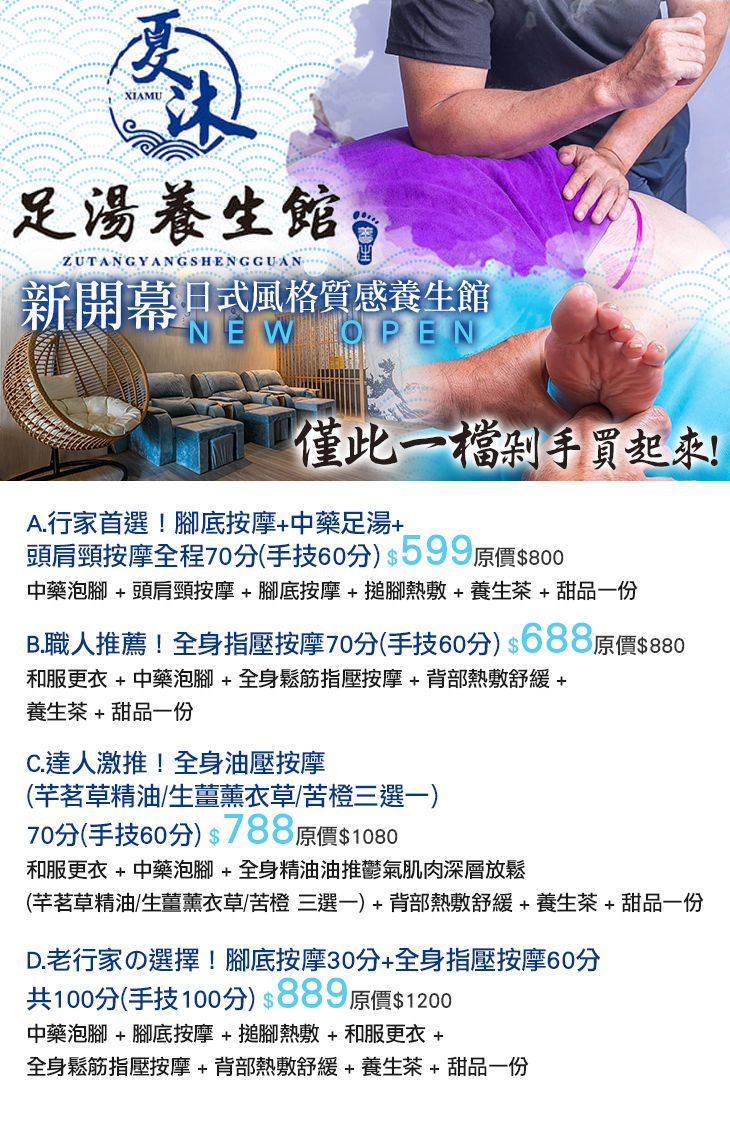 A.行家首選!腳底按摩+中藥足湯+頭肩頸按摩全程70分(手技60分) / B.職人推薦!全身指壓按摩70分(手技60分) / C.達人激推!全身油壓按摩(芊茗草精油/生薑薰衣草/苦橙 三選一)70分(手技60分) / D.老行家の選擇!腳底按摩30分+全身指壓按摩60分+頭肩頸按摩共100分(手技100分)