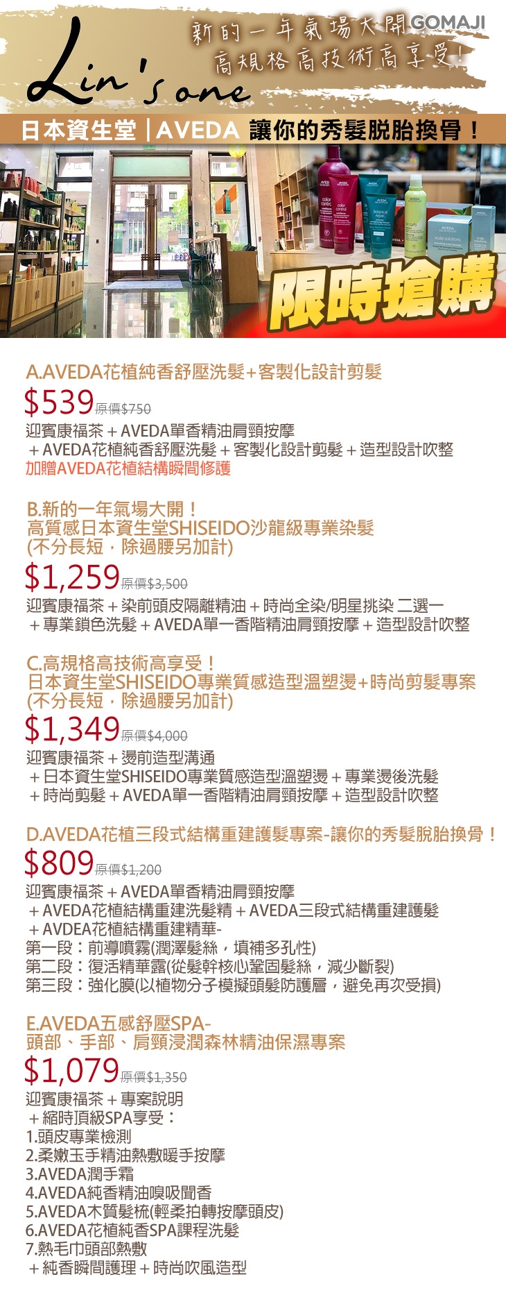 A.AVEDA花植純香舒壓洗髮+客製化設計剪髮 / B.新的一年氣場大開!高質感日本資生堂SHISEIDO沙龍級專業染髮(不分長短,除過腰另加計) / C.高規格高技術高享受!日本資生堂SHISEIDO專業質感造型溫塑燙+時尚剪髮專案(不分長短,除過腰另加計) / D.AVEDA花植三段式結構重建護髮專案-讓你的秀髮脫胎換骨! / E.AVEDA五感舒壓SPA-頭部、手部、肩頸浸潤森林精油保濕專案