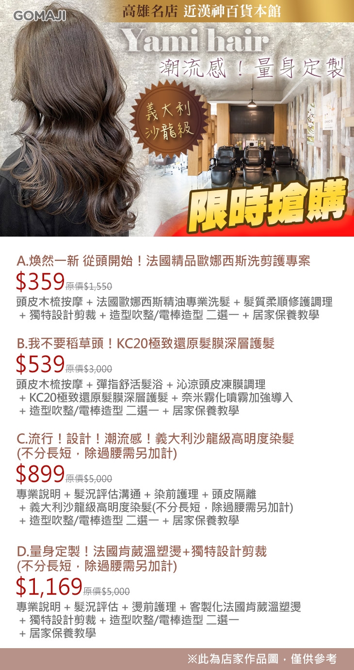 A.煥然一新 從頭開始!法國精品歐娜西斯洗剪護專案 / B.我不要稻草頭!KC20極致還原髮膜深層護髮 / C.流行!設計!潮流感!義大利沙龍級高明度染髮(不分長短,除過腰需另加計) / D.量身定製!法國肯葳溫塑燙+獨特設計剪裁(不分長短,除過腰需另加計)