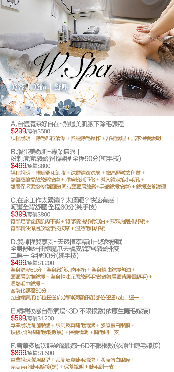 A.自信清涼好自在~熱蠟美肌腋下除毛課程 / B.滑蛋美嫩肌~專業無暇|粉刺痘痘深層淨化課程全程90分(純手技) / C.在家工作太緊繃?太僵硬?快速有感|呵護全背舒壓全程60分(純手技) / D.雙課程雙享受~天然植萃精油-悠然舒眠|全身舒壓+曲線魔爪去橘皮/海神深層排痠 二選一全程90分(純手技) / E.精緻妝感自帶氣場~3D 不限根數(依原生睫毛嫁接) / F.奢華多層次輕盈蓬鬆感~6D不限根數(依原生睫毛嫁接)