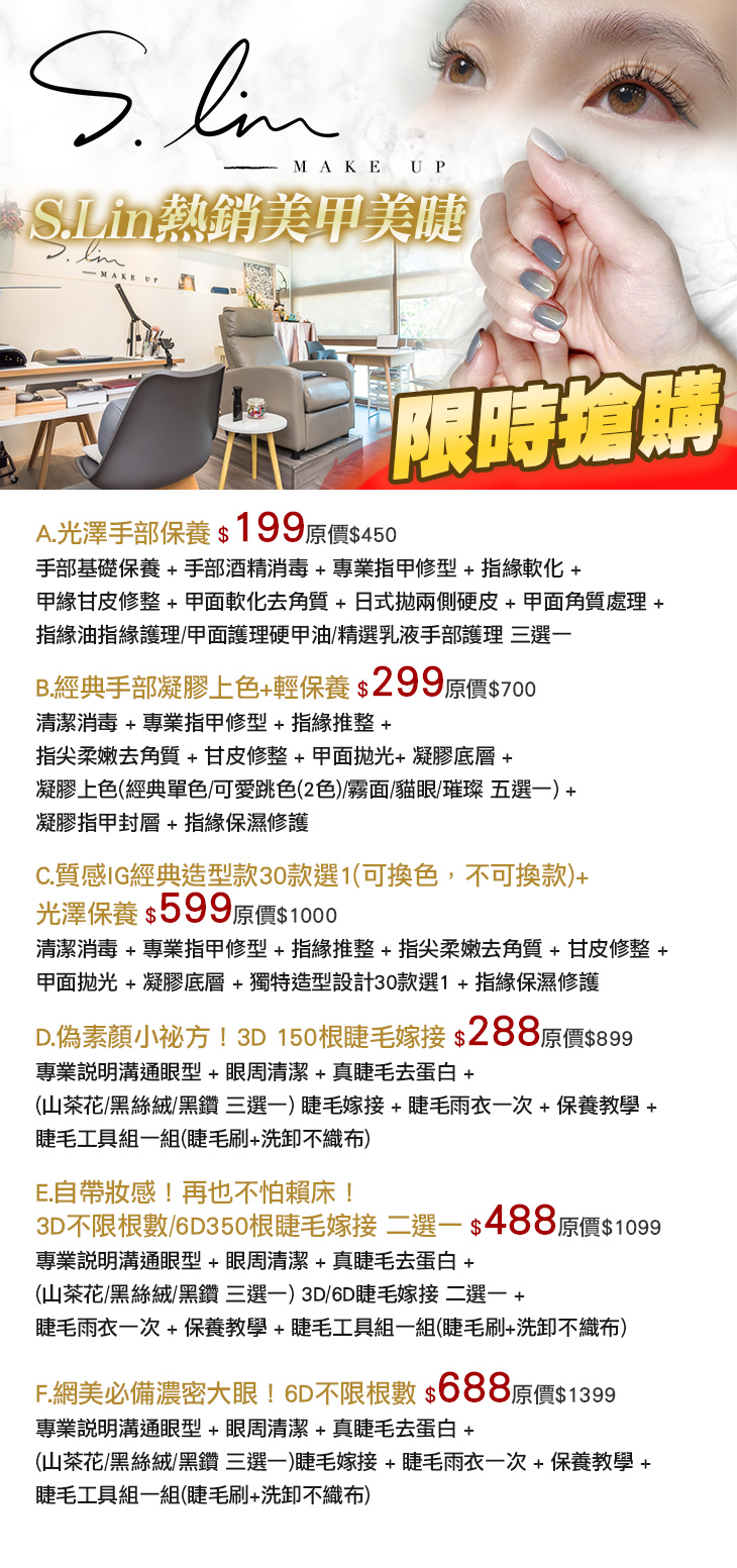 A.光澤手部保養 / B.經典手部凝膠上色+輕保養 / C.質感IG經典造型款30款選1(可換色,不可換款)+光澤保養 / D.偽素顏小祕方 ! 3D 150根睫毛嫁接 / E.自帶妝感!再也不怕賴床 ! 3D不限根數/6D350根睫毛嫁接 二擇一 / F.網美必備濃密大眼!6D不限根數