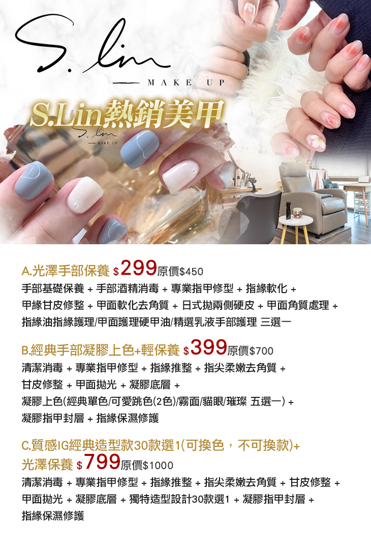 質感精緻的裝潢,以明亮的採光營造舒適的氛圍,打造專屬的美學空間!這裡提供專業的美甲服務,專精的手藝、親切的服務態度,讓您擁有倍受呵護的寵愛,變美同時也感受賓至如歸的幸福!愛美的您,還不快將【S.Lin整體造型工作室】加入收藏!