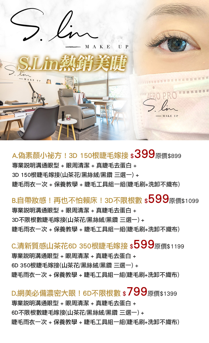 質感精緻的裝潢,以明亮的採光營造舒適的氛圍,打造專屬的美學空間!這裡提供專業的美睫服務,專精的手藝、親切的服務態度,讓您擁有倍受呵護的寵愛,變美同時也感受賓至如歸的幸福!愛美的您,還不快將【S.Lin整體造型工作室】加入收藏!