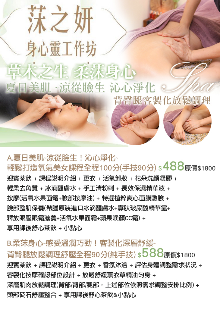 A.夏日美肌~涼從臉生!沁心淨化~輕鬆打造氧氣美女課程全程100分(手技90分) / B.柔莯身心~感受溫潤巧勁!客製化深層舒緩~背臀腿放鬆調理舒壓全程90分(純手技)