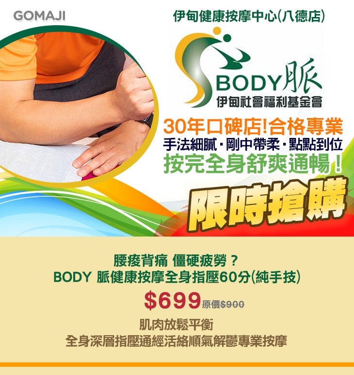 腰痠背痛 僵硬疲勞?BODY 脈健康按摩全身指壓60分(純手技)