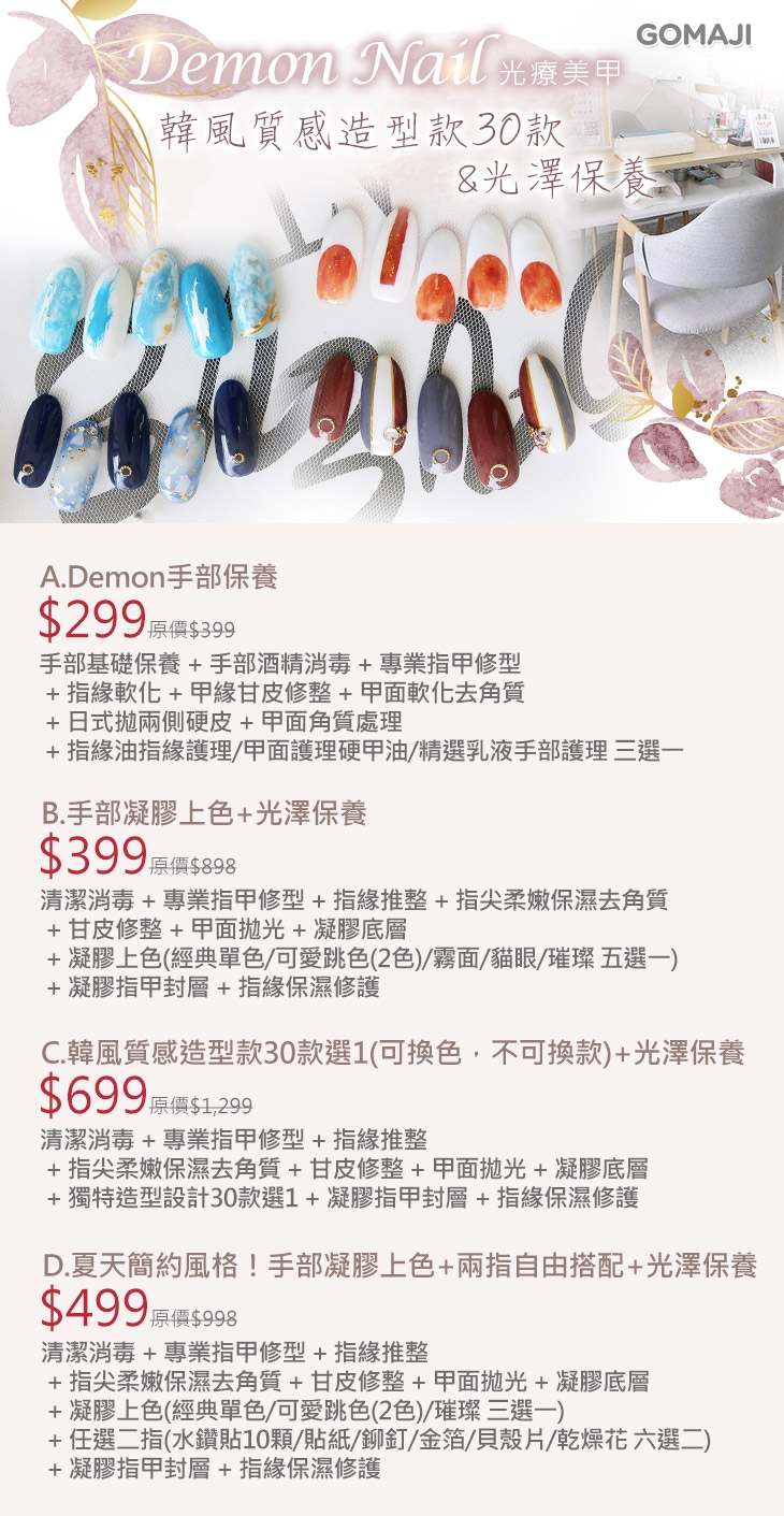 A.Demon手部保養 / B.手部凝膠上色+光澤保養 / C.韓風質感造型款30款選1(可換色,不可換款)+光澤保養 / D.夏天簡約風格!手部凝膠上色+兩指自由搭配+光澤保養