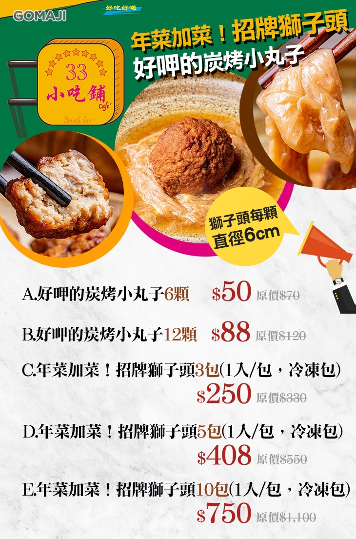 A.好呷的炭烤小丸子6顆 / B.好呷的炭烤小丸子12顆 / C.年菜加菜!招牌獅子頭3包(1入/包,冷凍包) / D.年菜加菜!招牌獅子頭5包(1入/包,冷凍包) / E.年菜加菜!招牌獅子頭10包(1入/包,冷凍包)