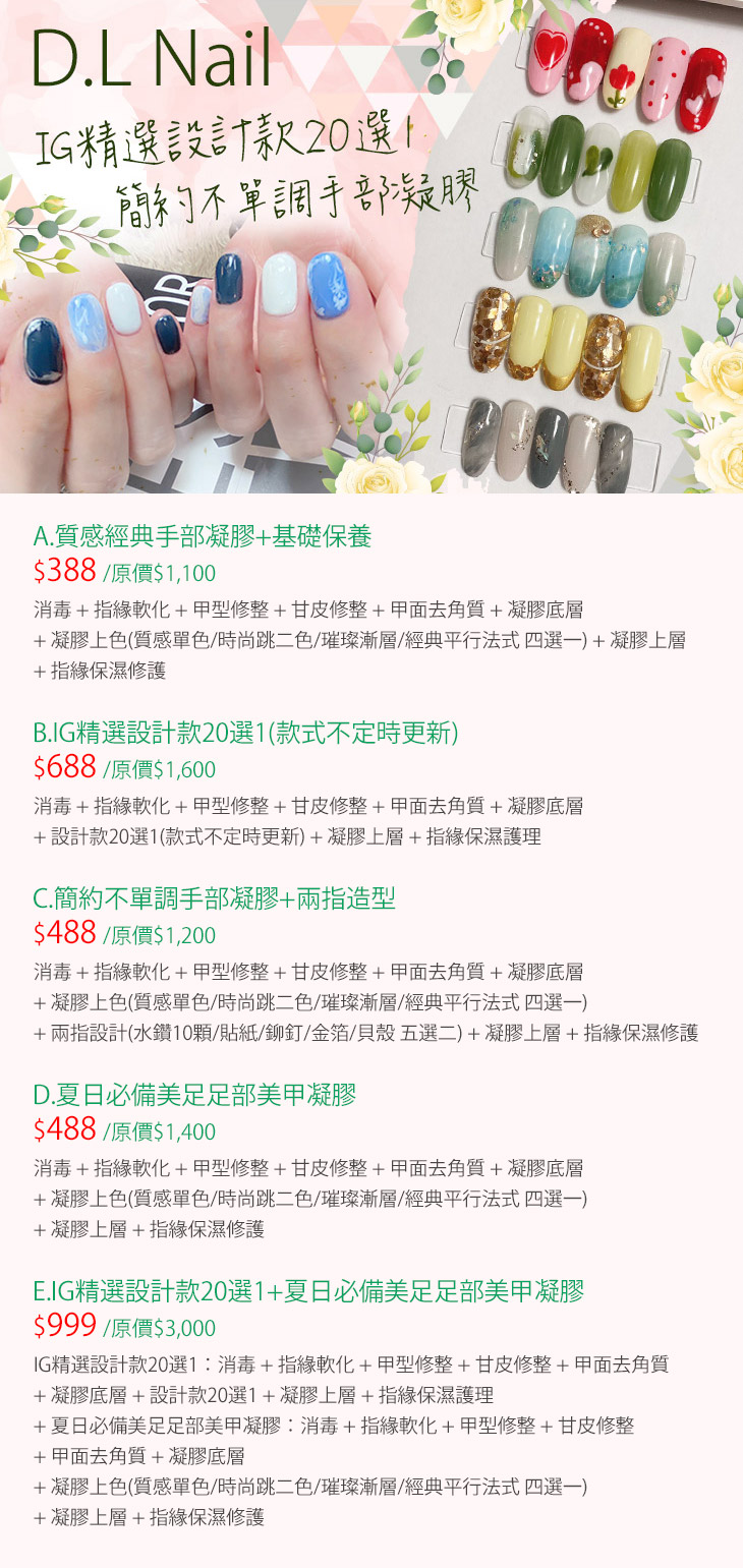 〈消毒 + 指緣軟化 + 甲型修整 + 甘皮修整 + 甲面去角質 + 凝膠底層 + 設計款20選1(款式不定時更新) + 凝膠上層 + 指緣保濕護理〉