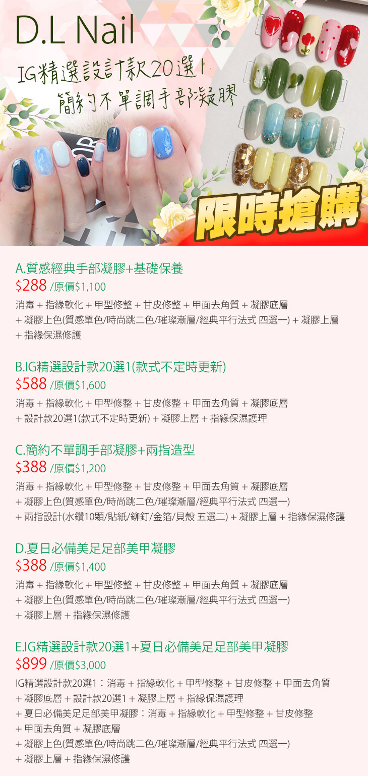 A.質感經典手部凝膠+基礎保養 / B.IG精選設計款20選1(款式不定時更新) / C.簡約不單調手部凝膠+兩指造型 / D.夏日必備美足足部美甲凝膠 / E.IG精選設計款20選1+夏日必備美足足部美甲凝膠