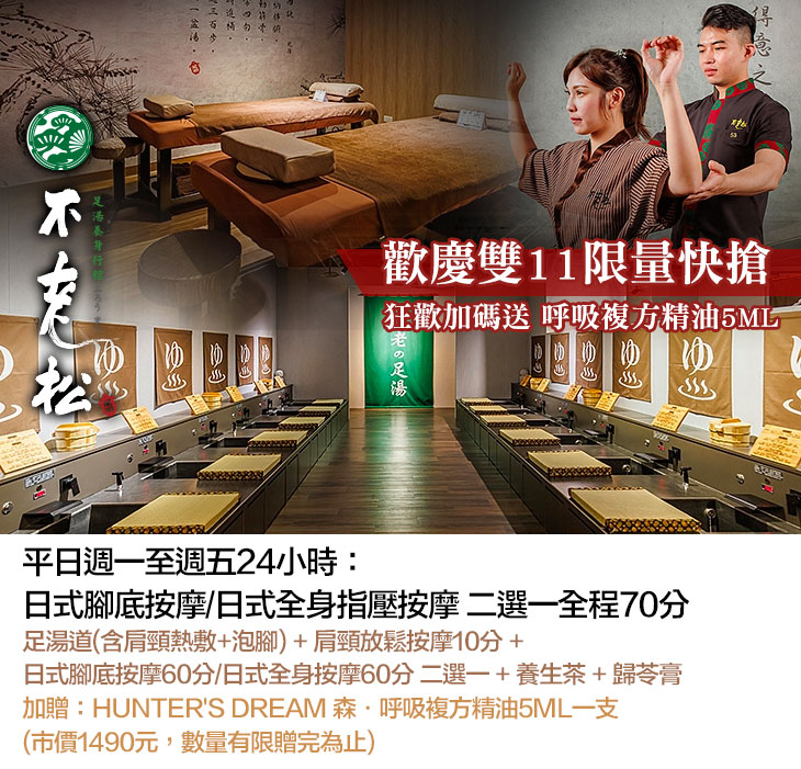 源自日本京都嵐山的中部春不荖足湯副品牌──不老松,為台中知名按摩大品牌店,深受在地消費者的喜愛與信賴,努力深耕台北市場,希望提供優質的頂級按摩服務給消費者美好體驗,氣派、端莊的日系裝潢,打造一處能恣意放鬆的靜謐空間,環境寬敞、燈光明亮,讓人一入室內,便感到賓至如歸!