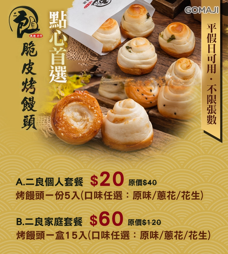 獨樂樂,不如眾樂樂!份量十足的「家庭套餐」,讓您可以將【二良】的美味分享出去!顆顆渾圓、外酥內韌的烤饅頭,口味豐富,讓每個人都能品味到喜愛的口感~趁熱現吃,很美味,隔天重新加熱,也不失口感唷!