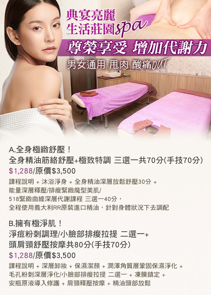 A.全身極緻舒壓!全身精油筋絡舒壓+極致特調 三選一共70分(手技70分) / B.擁有極淨肌!淨痘粉刺調理/小臉部排痠拉提 二選一+頭肩頸舒壓按摩共80分(手技70分)