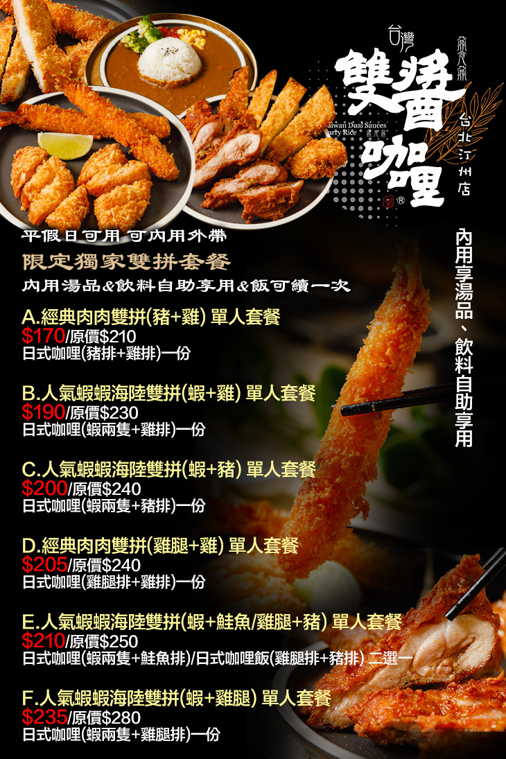 「不僅要讓大家吃得飽,同時也要讓真材實料的餐點,在您心中留下深刻印象。」秉持著職人精神、用心經營,透過創意巧思研發出匠心獨具的雙醬咖哩。針對醬汁,延續秘方、悉心調製;針對食材的選用與組合,則講究細節、相輔相成,讓最終呈現的專屬美味,看似樸實、卻擁有新穎的靈魂,致力於滿足所有饕客挑剔的味蕾!【雙醬咖哩】口碑傳揚千里,成功在咖哩市場闖出一片天,讓咖哩控為之瘋狂,絕對值得您細細珍藏、再三回味!