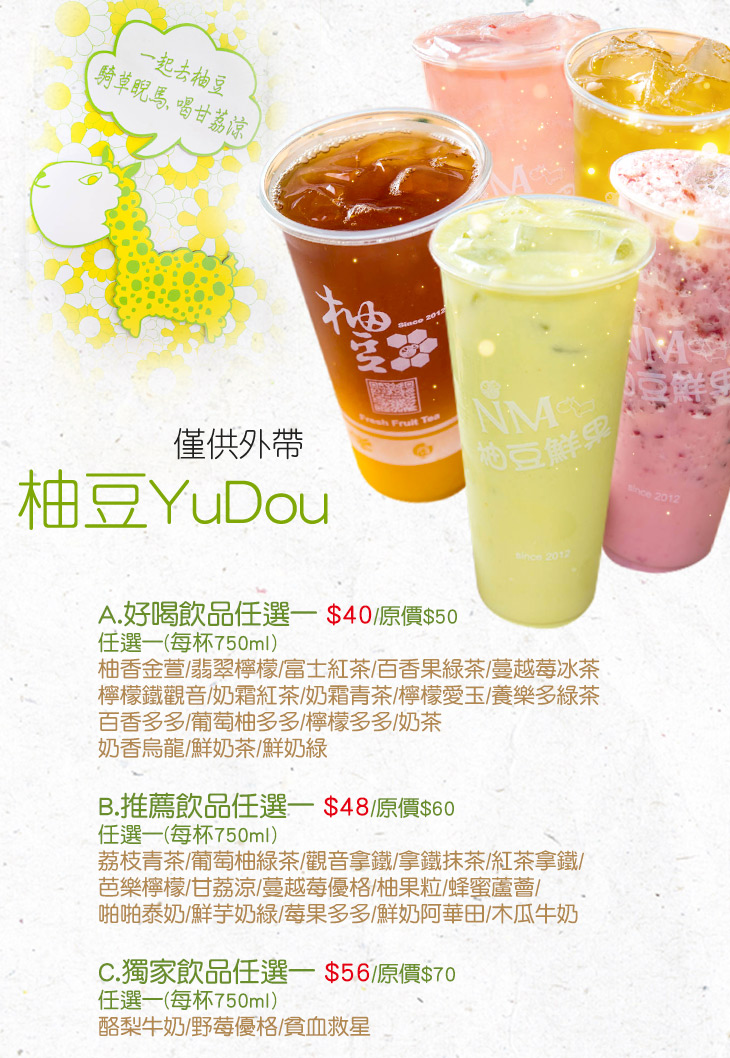 說到一年四季必不可少的東西,當然就是好喝解渴的手搖飲啦~為了讓顧客得以品嚐到新鮮現做的美味,《柚豆YuDou》堅持選用合格優質的原物料,並以全蔗糖取代傳統使用的果糖,喝起來清甜爽口、負擔減少,根本是女孩們的造福之星嘛!最重要的是,價格非常親民,品項的選擇也是廣泛多元,幾乎所有想得到的風味通通都有、任君挑選,想必現在您已感到口渴難耐了吧?那就趕緊動身前往潤喉一下吧!