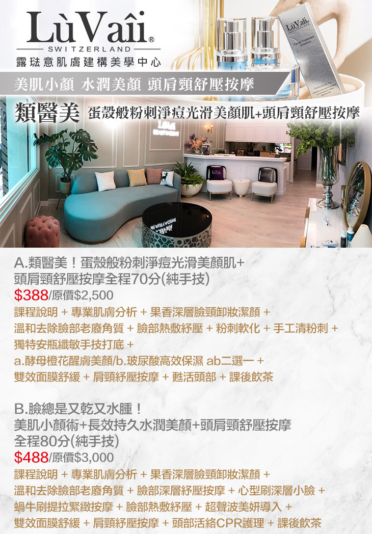 A.類醫美!蛋殼般粉刺淨痘光滑美顏肌+頭肩頸舒壓按摩全程70分(純手技) / B.臉總是又乾又水腫!美肌小顏術+長效持久水潤美顏+頭肩頸舒壓按摩全程80分(純手技)
