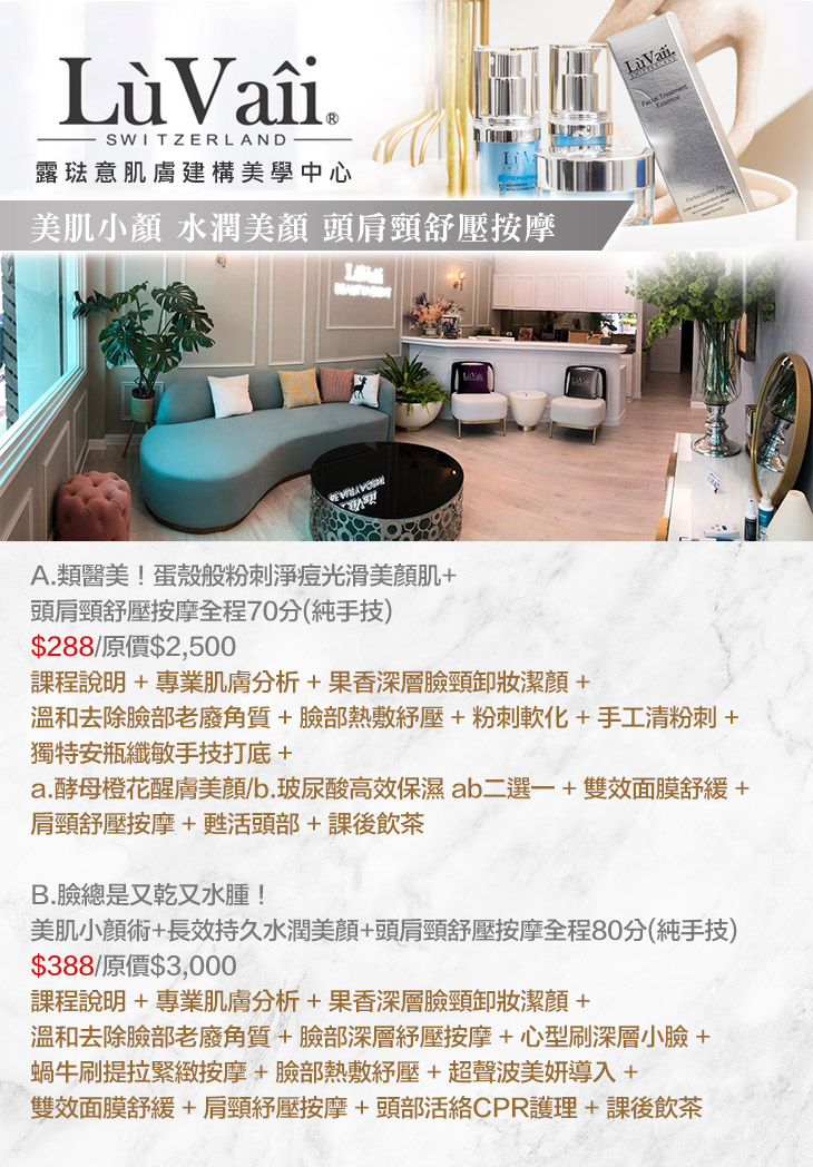 A.類醫美!蛋殼般粉刺淨痘光滑美顏肌+頭肩頸舒壓按摩全程70分(純手技) / B.臉總是又乾又水腫!美肌小顏術+長效持久水潤美顏+頭肩頸舒壓按摩全程80分(純手技)