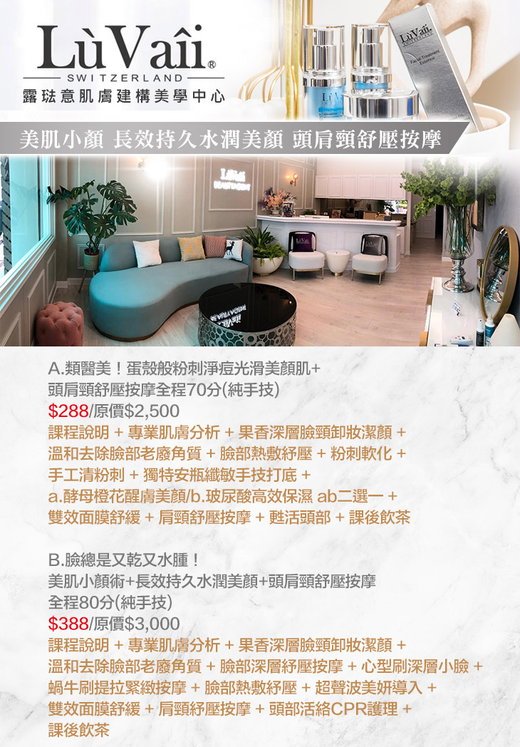 A.類醫美!蛋殼般粉刺淨痘光滑美顏肌+頭肩頸舒壓按摩全程70分(純手技) / B.臉總是又乾又水腫!美肌小顏術+長效持久水潤美顏+頭肩頸舒壓按摩全程80分(純手技)