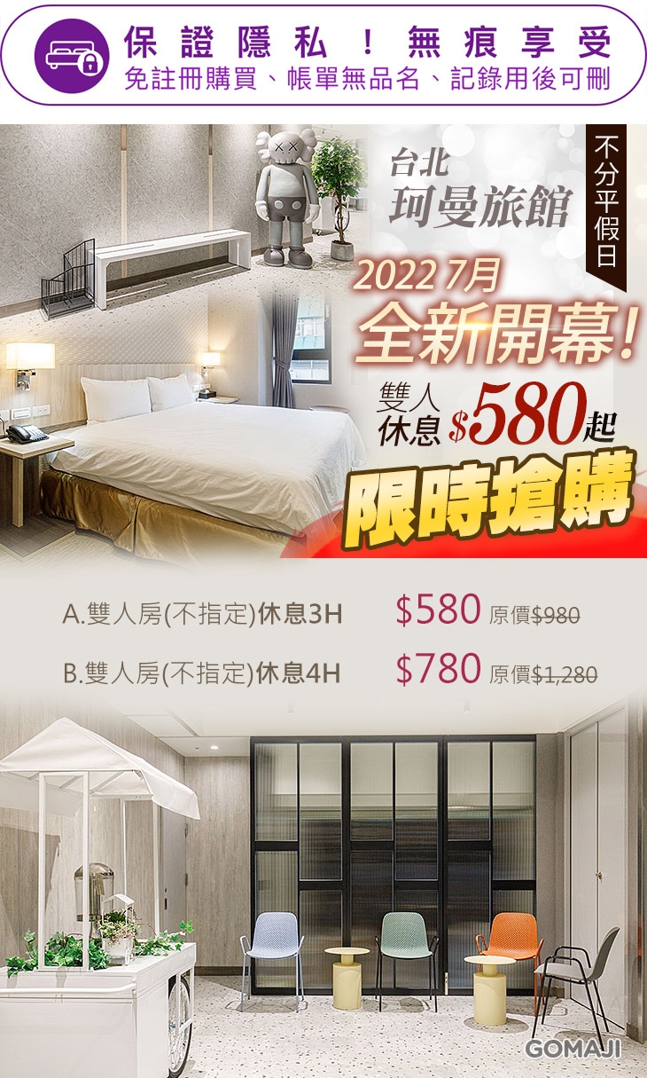 【台北-珂曼旅館】感謝麻吉們熱烈搶購,已全數賣光光。