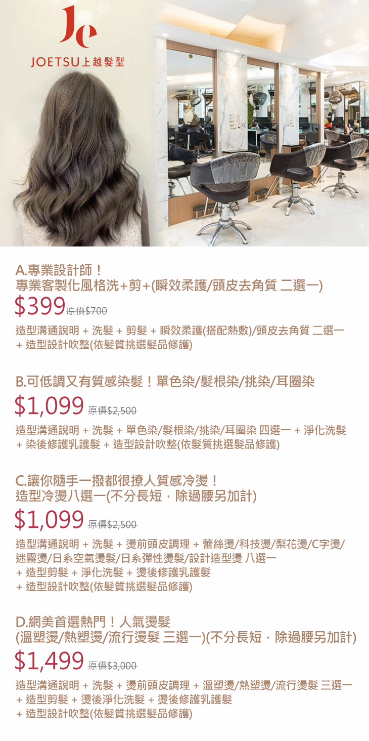 A.專業設計師!專業客製化風格洗+剪+(瞬效柔護/頭皮去角質 二選一) / B.可低調又有質感染髮!單色染/髮根染/挑染/耳圈染 / C.讓你隨手一撥都很撩人質感冷燙!造型冷燙八選一 / D.網美首選熱門!人氣燙髮(溫塑燙/熱塑燙/流行燙髮 三選一)
