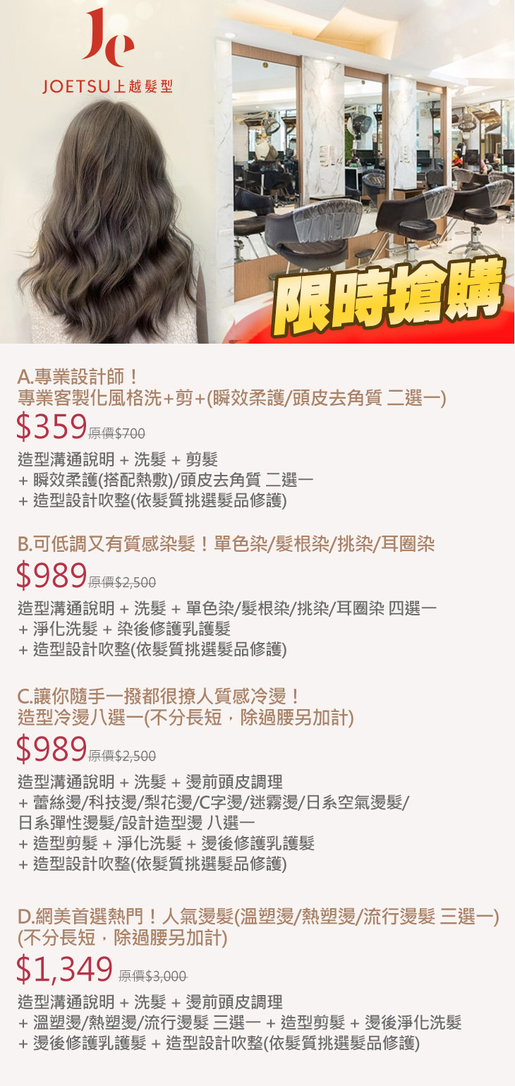 A.專業設計師!專業客製化風格洗+剪+(瞬效柔護/頭皮去角質 二選一) / B.可低調又有質感染髮!單色染/髮根染/挑染/耳圈染 / C.讓你隨手一撥都很撩人質感冷燙!造型冷燙八選一(不分長短,除過腰另加計) / D.網美首選熱門!人氣燙髮(溫塑燙/熱塑燙/流行燙髮 三選一)(不分長短,除過腰另加計)