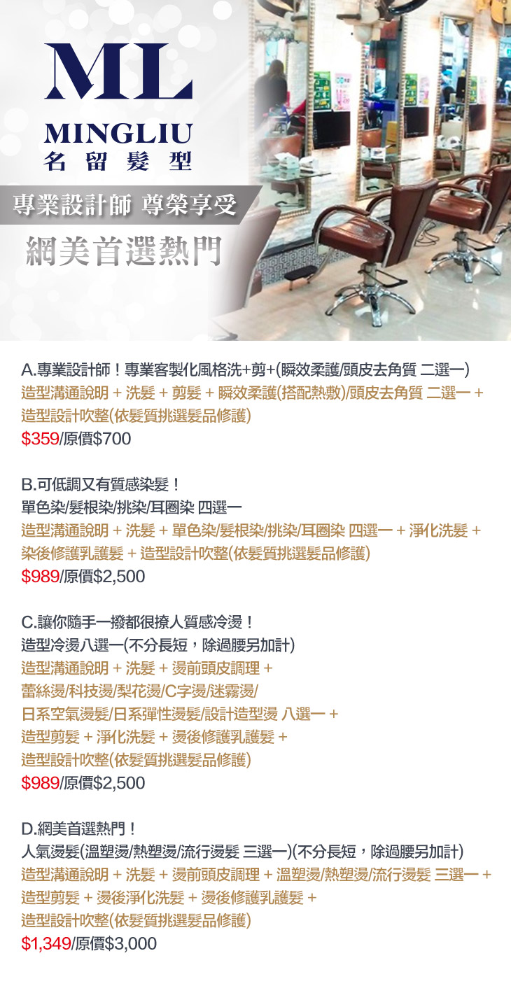 A.專業設計師!專業客製化風格洗+剪+(瞬效柔護/頭皮去角質 二選一) / B.可低調又有質感染髮!單色染/髮根染/挑染/耳圈染 四選一 / C.讓你隨手一撥都很撩人質感冷燙!造型冷燙八選一(不分長短,除過腰另加計) / D.網美首選熱門!人氣燙髮(溫塑燙/熱塑燙/流行燙髮 三選一)(不分長短,除過腰另加計)