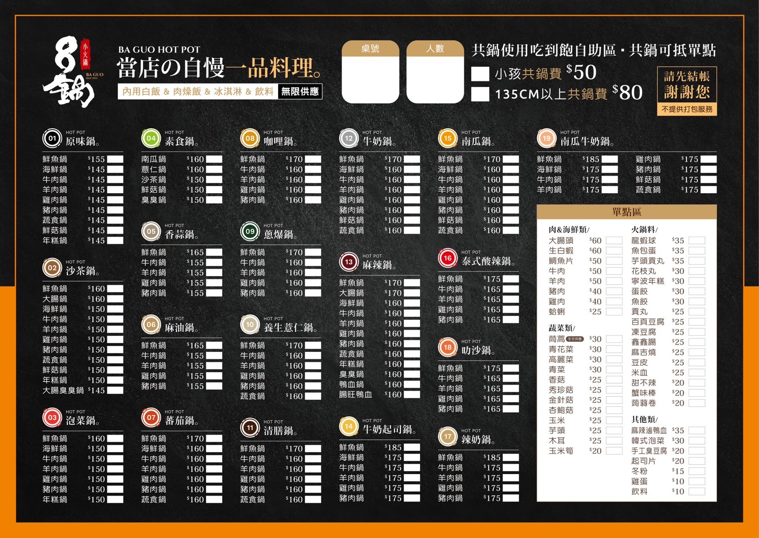 店面裝潢整潔明亮,寬敞的空間以溫暖的木色為主調,營造出一個舒適放鬆、適合聊天的用餐環境。【8鍋小火鍋】提供各式各樣不同口味的湯頭,高達19種鍋底供君選擇,主食的肉類、海鮮、魚類或蔬食等選擇種類繁多,應有盡有,店內還有提供自助吧,白飯、肉燥飯、冰淇淋與飲料等無限供應,非常適合同事朋友聚會、家庭親子聚餐的最佳首選。