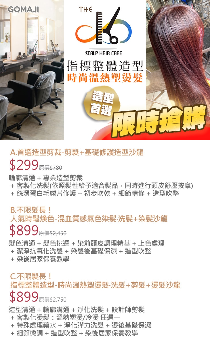 A.首選造型剪裁-剪髮+基礎修護造型沙龍 / B.不限髮長!人氣時髦煥色-混血質感氣色染髮‧洗髮+染髮沙龍 / C.不限髮長!指標整體造型-時尚溫熱塑燙髮‧洗髮+剪髮+燙髮沙龍