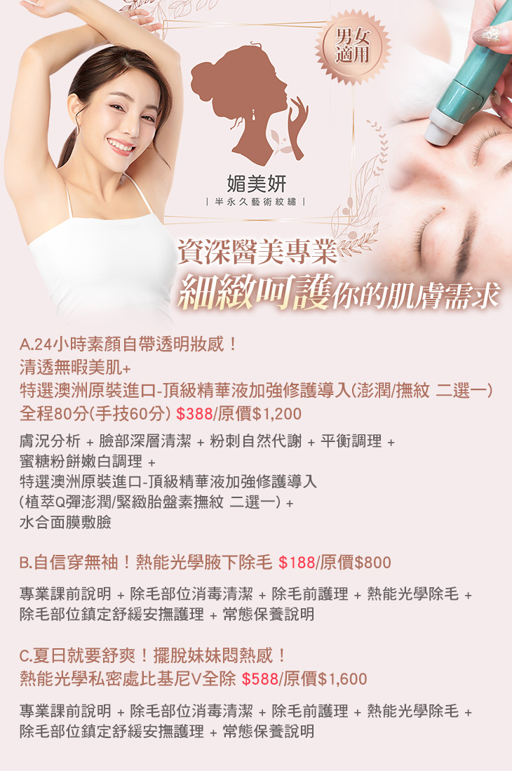 A.24小時素顏自帶透明妝感!清透無暇美肌+特選澳洲原裝進口-頂級精華液加強修護導入(澎潤/撫紋 二選一)全程80分(手技60分) / B.自信穿無袖!熱能光學腋下除毛 / C.夏日就要舒爽!擺脫妹妹悶熱感!熱能光學私密處比基尼V全除