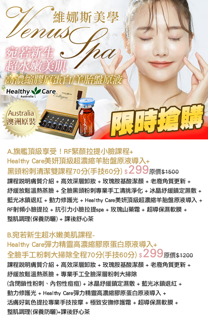 A.旗艦頂級享受!RF緊顏拉提小臉課程+Healthy Care美妍頂級超濃縮羊胎盤原液導入+黑頭粉刺清潔雙課程70分(手技60分) / B.宛若新生超水嫩美肌課程-Healthy Care彈力精靈高濃縮膠原蛋白原液導入+全臉手工粉刺大掃除全程70分(手技60分)