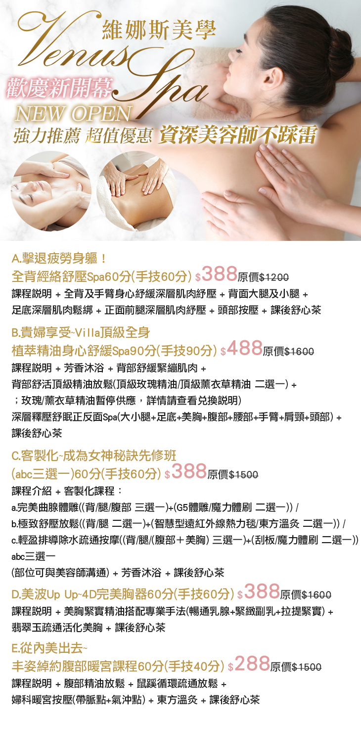 A.擊退疲勞身軀 ! 全背經絡舒壓Spa60分(手技60分) / B.貴婦享受~Villa頂級全身植萃精油身心舒緩Spa90分(手技90分) / C.客製化~成為女神秘訣先修班(abc三選一)60分(手技60分) / D.美波Up Up~4D完美胸器60分(手技60分) / E.從內美出去~丰姿綽約腹部暖宮課程60分(手技40分)
