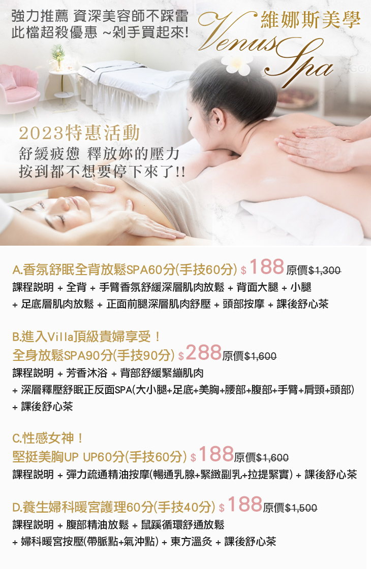 A.香氛舒眠全背放鬆SPA60分(手技60分) / B.進入Villa頂級貴婦享受!全身放鬆SPA90分(手技90分) / C.性感女神!堅挺美胸UP UP60分(手技60分) / D.養生婦科暖宮護理60分(手技40分)