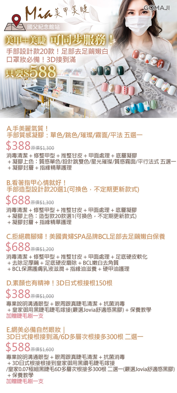 A.手美麗氣質!手部質感凝膠:單色/跳色/璀璨/霧面/平法 五選一 / B.看著指甲心情就好!手部造型設計款20選1(可換色,不定期更新款式) / C.拒絕農腳婦!美國貴婦SPA品牌BCL足部去足繭嫩白保養 / D.素顏也有精神!3D日式根接根150根 / E.網美必備自然眼妝|3D日式接根接到滿/6D多層次根接多300根 二選一