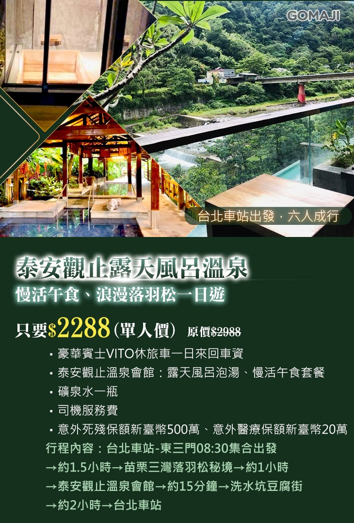 〈含豪華賓士VITO休旅車一日來回車資 + 泰安觀止溫泉會館:露天風呂泡湯、慢活午食套餐 + 礦泉水一瓶 + 司機服務費 + 意外死殘保額新臺幣500萬、意外醫療保額新臺幣20萬,行程內容:台北車站-東三門08:30集合出發→約1.5小時→苗栗三灣落羽松秘境→約1小時→泰安觀止溫泉會館→約15分鐘→洗水坑豆腐街→約2小時→台北車站〉