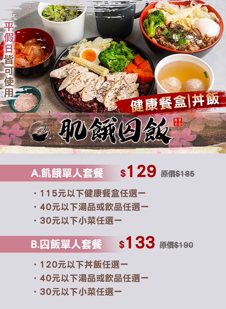 提供多樣化口味的丼飯與健康餐盒,滿足顧客不同的味蕾需求,是【肌餓囚飯】秉持的理念,嚴格控管食材來源與品質,選用當季新鮮食材,精心搭配、用心製作出每一份餐點,致力於讓您吃得安心又健康,保證一試成主顧,絕對是您正餐外食的最佳首選!