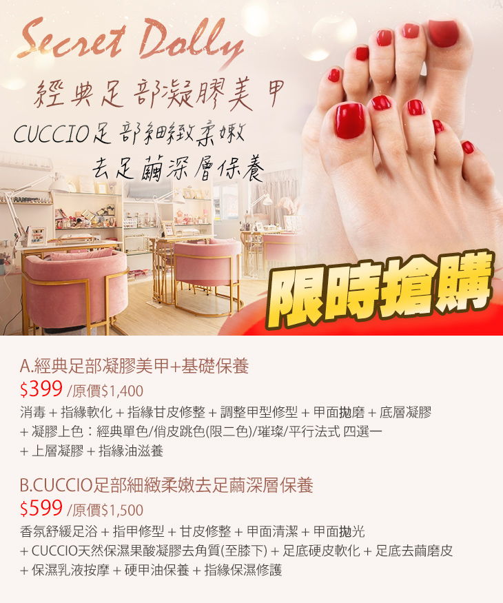 選用知名手足養護品牌-CUCCIO的產品為您保養足部,先溫和清潔雙足的粗糙角質,再以保濕產品補水滋養,讓雙足回到細緻柔嫩的狀態~擁有一雙美麗動人的裸足!