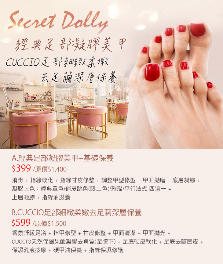 選用知名手足養護品牌-CUCCIO的產品為您保養足部,先溫和清潔雙足的粗糙角質,再以保濕產品補水滋養,讓雙足回到細緻柔嫩的狀態~擁有一雙美麗動人的裸足!
