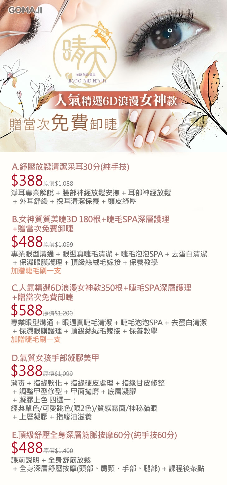 A.紓壓放鬆清潔采耳30分(純手技) / B.女神質質美睫3D 180根+睫毛SPA深層護理+贈當次免費卸睫 / C.人氣精選6D浪漫女神款350根+睫毛SPA深層護理+贈當次免費卸睫 / D.氣質女孩手部凝膠美甲 / E.頂級舒壓全身深層筋脈按摩60分(純手技60分)