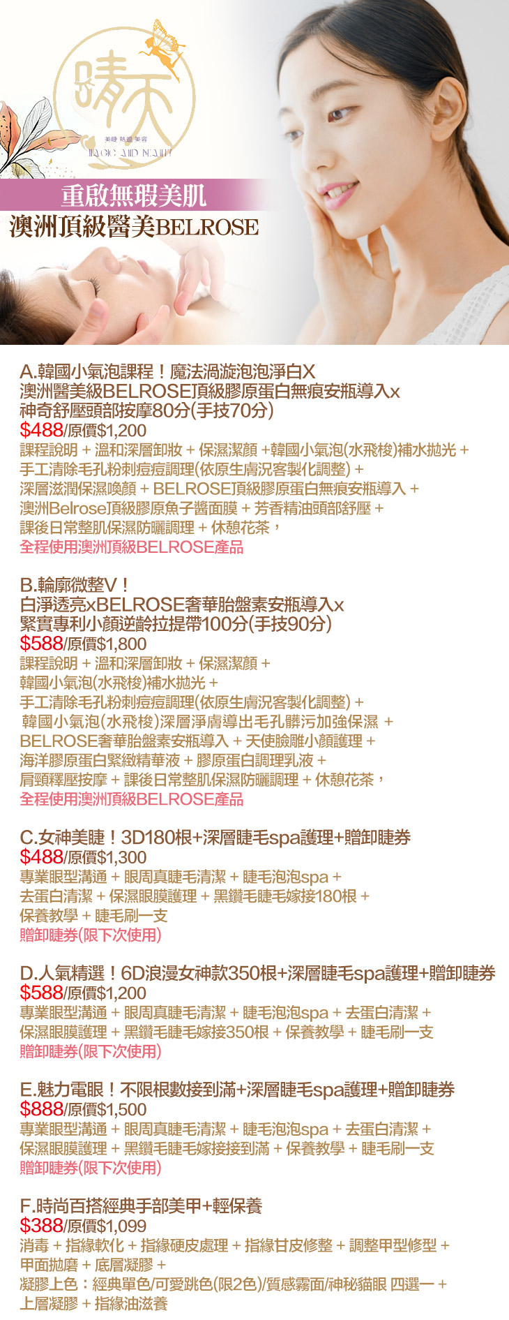 A.韓國小氣泡課程!魔法渦漩泡泡淨白X澳洲醫美級BELROSE頂級膠原蛋白無痕安瓶導入x神奇舒壓頭部按摩80分(手技70分)/B.輪廓微整V!白淨透亮xBELROSE奢華胎盤素安瓶導入x緊實專利小顏逆齡拉提帶100分(手技90分)/C.女神美睫!3D180根+深層睫毛spa護理+贈卸睫券/D.人氣精選!6D浪漫女神款350根+深層睫毛spa護理+贈卸睫券/E.魅力電眼!不限根數接到滿+深層睫毛spa護理+贈卸睫券/F.時尚百搭經典手部美甲+輕保養