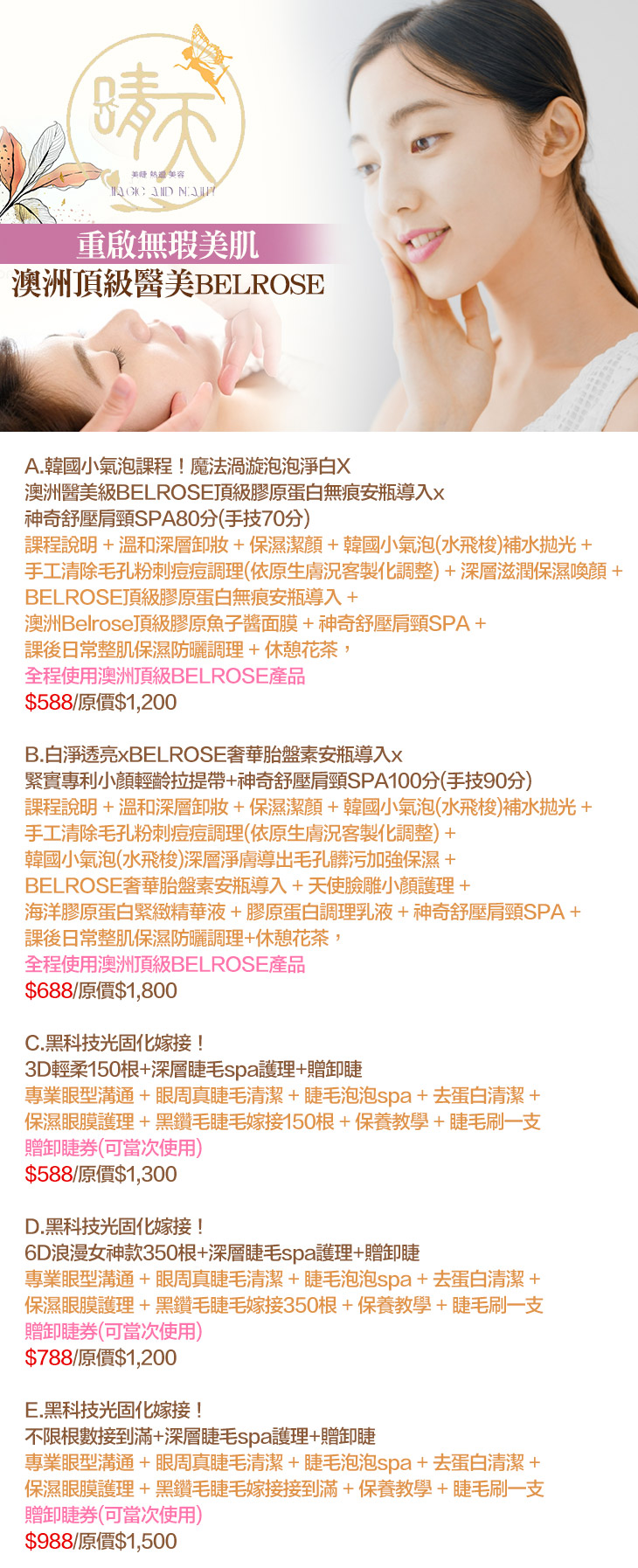 A.韓國小氣泡課程!魔法渦漩泡泡淨白X澳洲醫美級BELROSE頂級膠原蛋白無痕安瓶導入x神奇舒壓肩頸SPA80分(手技70分)/B.白淨透亮xBELROSE奢華胎盤素安瓶導入x緊實專利小顏輕齡拉提帶+神奇舒壓肩頸SPA100分(手技90分)/C.黑科技光固化嫁接!3D輕柔150根+深層睫毛spa護理+贈卸睫/D.黑科技光固化嫁接!6D浪漫女神款350根+深層睫毛spa護理+贈卸睫/E.黑科技光固化嫁接!不限根數接到滿+深層睫毛spa護理+贈卸睫