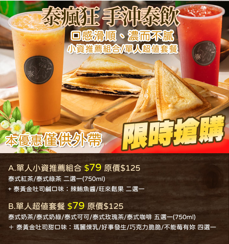 〈泰式奶茶/泰式奶綠/泰式可可/泰式玫瑰茶/泰式咖啡 五選一(750ml) + 泰黃金吐司甜口味:瑪麗煉乳/好事發生/巧克力脆脆/不能莓有妳 四選一〉