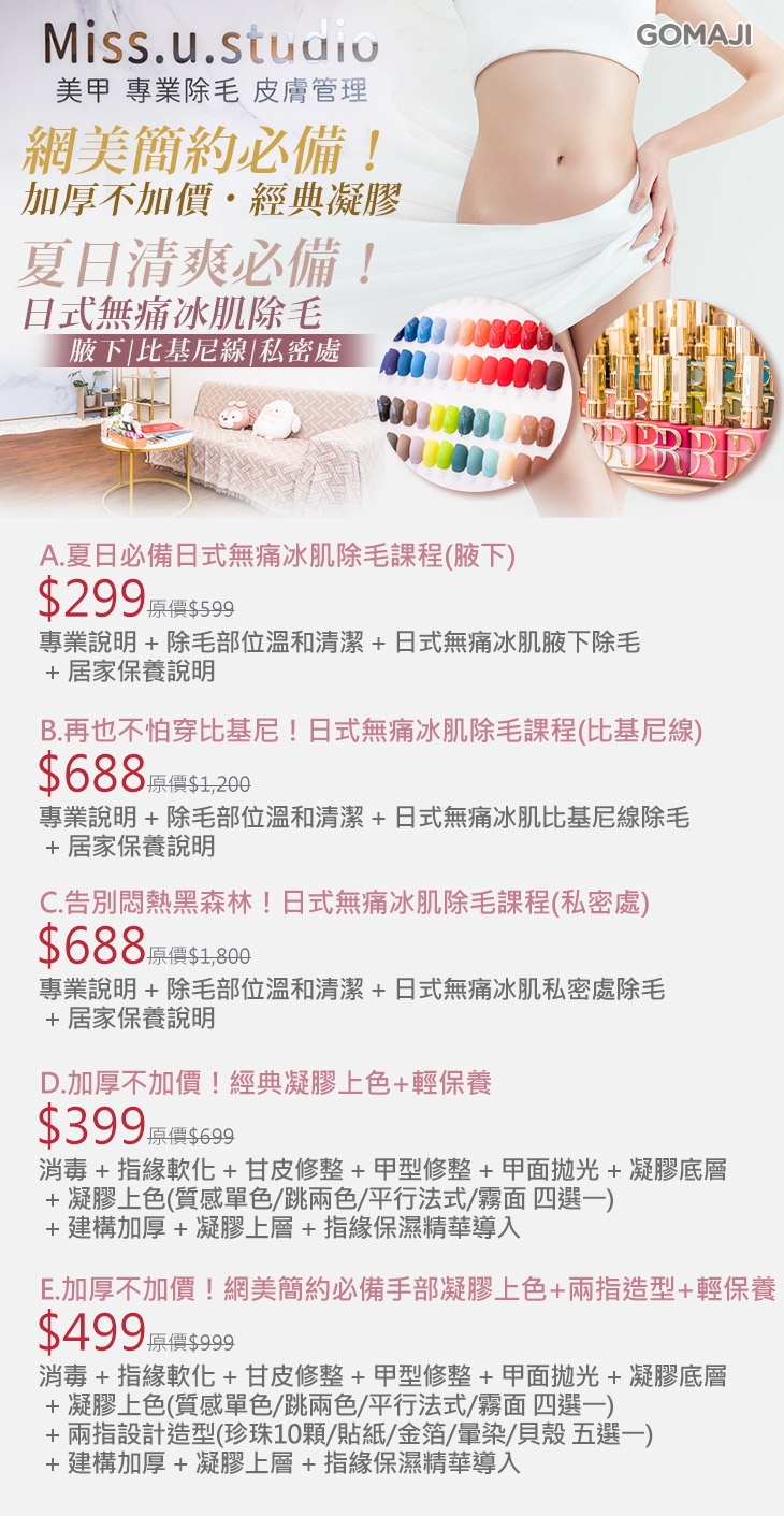 A.夏日必備日式無痛冰肌除毛課程(腋下) / B.再也不怕穿比基尼!日式無痛冰肌除毛課程(比基尼線) / C.告別悶熱黑森林!日式無痛冰肌除毛課程(私密處) / D.加厚不加價!經典凝膠上色+輕保養 / E.加厚不加價!網美簡約必備手部凝膠上色+兩指造型+輕保養