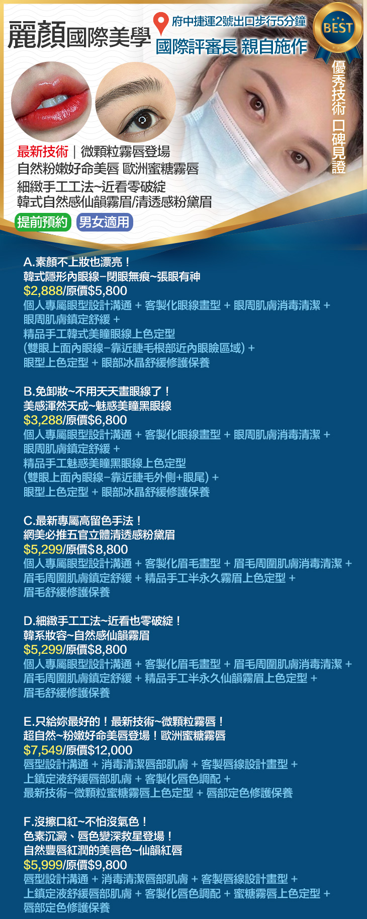 A.素顏不上妝也漂亮!韓式隱形內眼線-閉眼無痕~張眼有神 / B.免卸妝~不用天天畫眼線了!美感渾然天成~魅惑美瞳黑眼線 / C.最新專屬高留色手法!網美必推五官立體清透感粉黛眉 / D.細緻手工工法~近看也零破綻!韓系妝容~自然感仙韻霧眉 / E.只給妳最好的!最新技術~微顆粒霧唇!超自然~粉嫩好命美唇登場!歐洲蜜糖霧唇 / F.沒擦口紅~不怕沒氣色!色素沉澱、唇色變深救星登場!自然豐唇紅潤的美唇色~仙韻紅唇