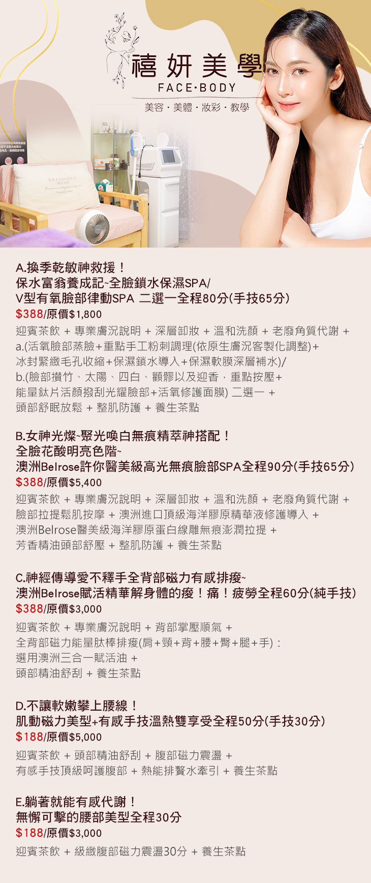 A.換季乾敏神救援!保水富翁養成記~全臉鎖水保濕SPA/V型有氧臉部律動SPA 二選一全程80分/B.女神光燦~聚光喚白無痕精萃神搭配!全臉花酸明亮色階~澳洲Belrose許你醫美級高光無痕臉部SPA全程90分/C.神經傳導愛不釋手全背部磁力有感排痠~澳洲Belrose賦活精華解身體的痠!痛!疲勞全程60分/D.不讓軟嫩攀上腰線!肌動磁力美型+有感手技溫熱雙享受全程50分/E.躺著就能有感代謝!無懈可擊的腰部美型全程30分