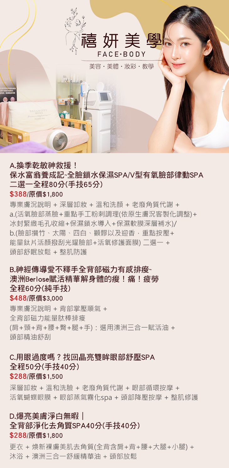 A.換季乾敏神救援!保水富翁養成記~全臉鎖水保濕SPA/V型有氧臉部律動SPA 二選一全程80分(手技65分) / B.神經傳導愛不釋手全背部磁力有感排痠~澳洲Berlose賦活精華解身體的痠!痛!疲勞全程60分(純手技) / C.用眼過度嗎?找回晶亮雙眸眼部舒壓SPA全程50分(手技40分) / D.爆亮美膚淨白無暇|全背部淨化去角質SPA40分(手技40分)