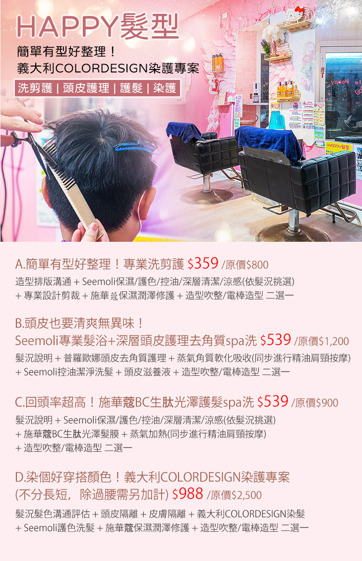 A.簡單有型好整理!專業洗剪護 / B.頭皮也要清爽無異味!Seemoli專業髮浴+深層頭皮護理去角質spa洗 / C.回頭率超高!施華蔻BC生肽光澤護髮spa洗 / D.染個好穿搭顏色!義大利COLORDESIGN染護專案(不分長短,除過腰需另加計)