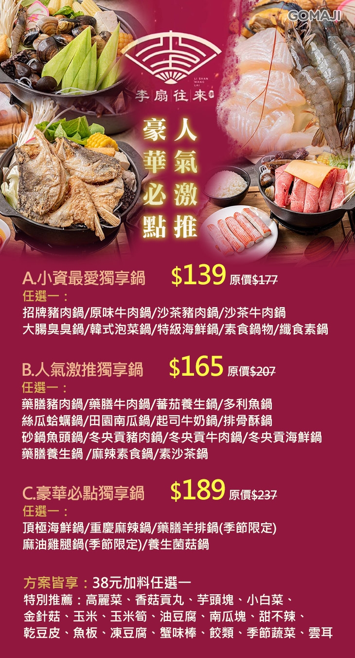 一年四季都適宜享用的鍋物,【李扇往萊極鍋物】以新鮮優選的食材與每日精燉的風味湯底呈現,讓您品味湯頭香醇、食材鮮美,一百分的鍋物饗宴!